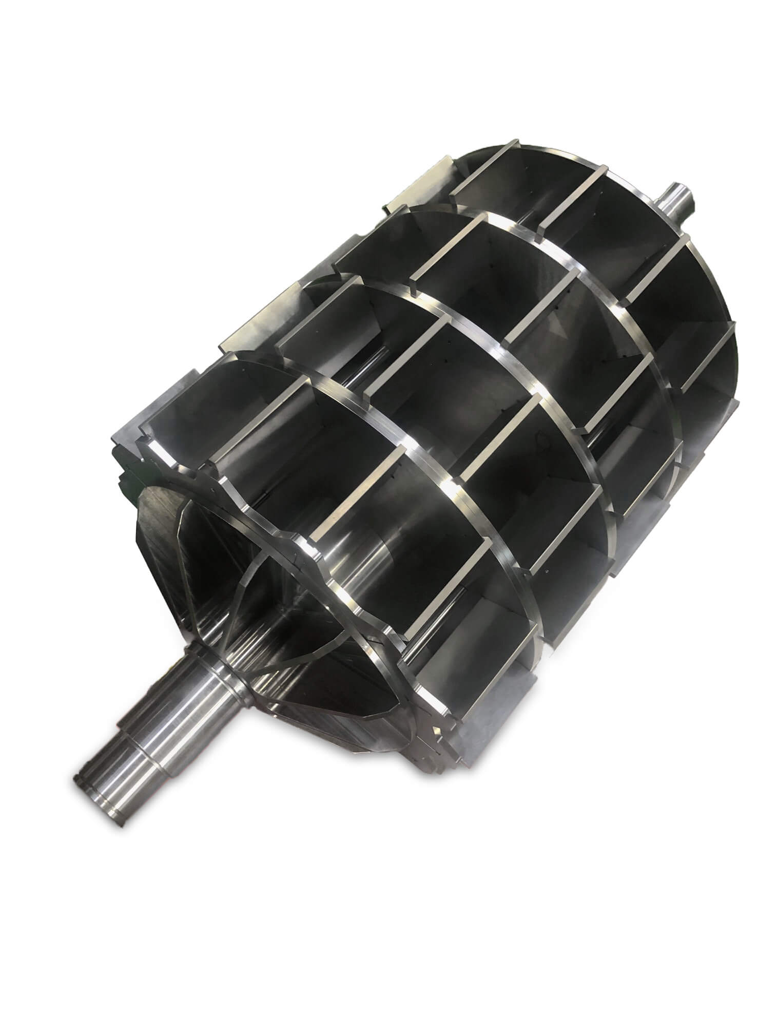 本製品は、高速回転によって紙を効率よく粉砕するための回転ローター部品です。